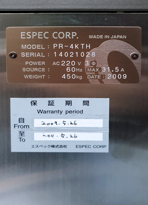 ID 121210019 Description N/A Manufacturer ESPEC Model PR-4KTH Vintage 2009 Serial No. 14021028 Quantity 1 Condition As-is EquipmentDetail Temp Humid Chamber 8,270 작성일 Main text 22.10.18 22.05.03 댓글목록 등록된 댓글이 없습니다.